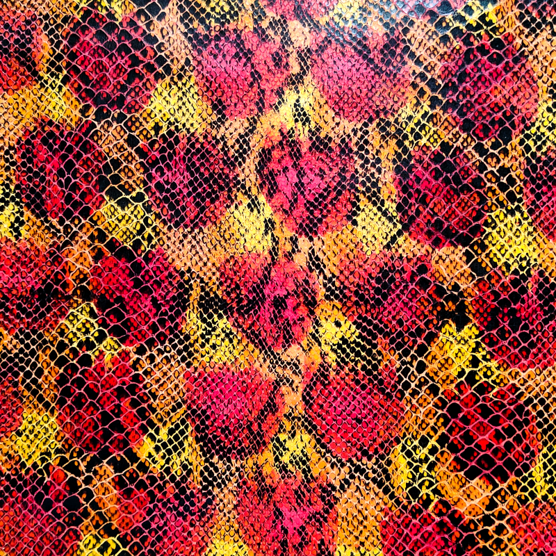 Qualité : cuir pleine fleur, souple, imprimée serpent, jaune, orange, rouge et noir